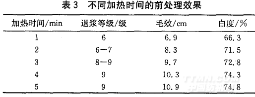工藝處方:純棉坯布2 g,NaOH 20 g/L ,H202 20 g/L ,FCB 2 g/L 、MRN 6 g/L,浴比1:20,微波中低火 加熱l~5 min(水浴沸騰后開始計時,以下類同)。實 驗結果見表3。由表3可知:中低火處理5min 的織物 潤濕性及退漿效果、白度可達到水浴鍋處理50min的效果。