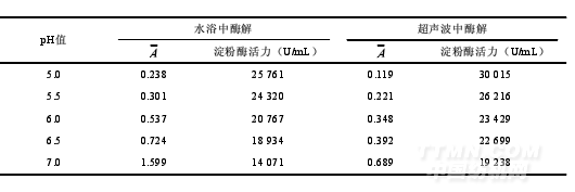 分別配制pH值為5.0,5.5,6.0,6.5,7.0的磷酸氫二鈉-檸檬酸緩沖溶液,只改變緩沖體系,其余按(3.2)試驗,比較在不同pH值條件下超聲波預處理對淀粉酶活力測定結果的影響,測定結果記錄如表4。