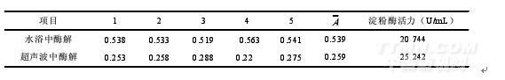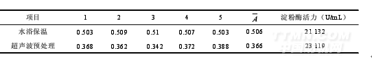 分別取稀釋酶液10mL放入50℃的水浴鍋中與50℃的超聲波水浴中,預處理15min后取出。按(2.1)測定兩種方法預處理后淀粉酶的活力,每種方法分別測定5次,其結果記錄如表2。
