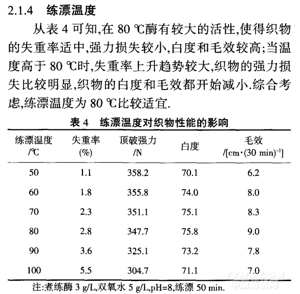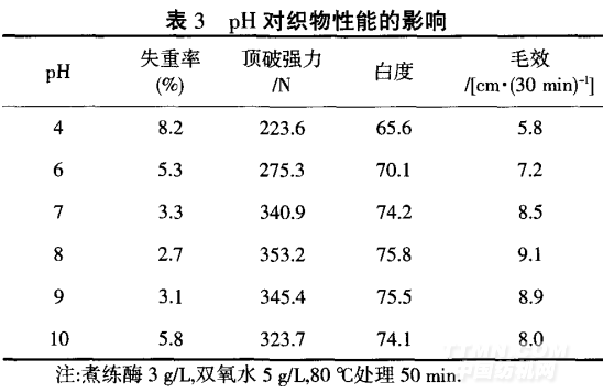 從表3可知,織物的失重率隨著pH的增大先減 小后增大,而織物的強力隨著pH的增大先增大后減 小,原因是強酸對纖維素纖維的損傷很大,纖維素發 生了降解,使得失重率較大,強力損傷嚴重;當pH=7~9 時,失重率明顯比酸性條件小,對纖維素損傷較小;堿 性較強對纖維素也有一定的損傷,此時的失重率又有 明顯上升,強力也有下降;織物的白度和毛效都隨著pH的增大先增大后減小,但過酸或者過堿使得酶失 去活性,不能與雙氧水較好的發揮協同作用去除雜質, 使得織物的白度和毛效變化都很小.綜合考慮,選擇 pH=8.