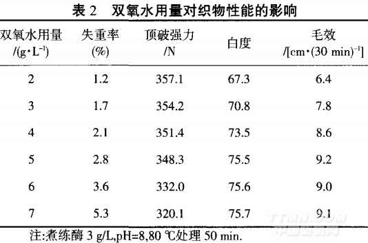 從表2可知,雙氧水用量高于5 g/L時,織物的失 重率增大比較明顯,主要是雙氧水用量適宜時雜質氧 化溶解,而超過一定值以后,纖維素纖維被氧化(發生 降解),使得失重較大;當>5 g/L時,強力損失比較明顯. 由于雙氧水適量時是對雜質的去除,對織物強力影響 較小,當超過一定量后纖維受到了潛在的損傷,使強力 下降趨勢明顯;而雙氧水用量超過一定值以后,對雜質 的去除作用減小,使得白度和毛效提高不明顯.綜合考 慮,選用雙氧水用量為5 g/L.