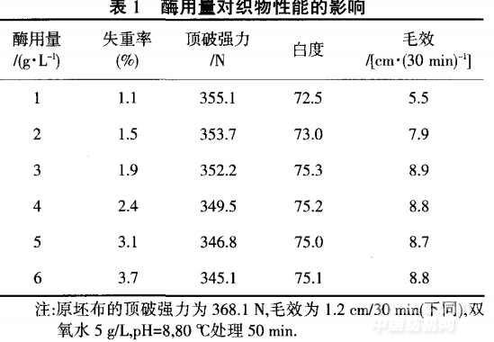酶具有高效性和專一性,能打通纖維的內部通道, 與纖維上雜質相結合,并將其分解去除.從表1可知, 隨著酶用量的提高,織物上雜質不斷地被去除,失重 率逐漸增大;酶的作用條件比較溫和,強力損失較小; 白度和毛效隨著酶用量的提高先增大,當酶用量高于 3 g/L時,白度和毛效變化很小,原因是果膠一般存在 于纖維和蠟質之間,把蠟質粘在纖維上,在酶的作用下,果膠分解去除了蠟質等雜質,使得白度和毛效提 高較快,可能是在3 g/L用量時,煮練酶對織物的作用 已經基本完成,或是酶的活性已經達到飽和.綜合考 慮,選取酶用量為3 g/L.