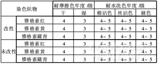 按優化改性工藝(改性劑9.5g/L,NaOH5.0g/L,浴比50∶1,80℃改性55min)對棉織物進行改性,按優化低鹽染色工藝[活性染料2%(omf),元明粉10g/L,浴比50∶1,染色溫度55℃,染色時間雅格素紅60min、雅格素黃和雅格素藏青50min]染色,研究改性低鹽染色織物和未改性常規染色織物的色牢度,結果見表6。