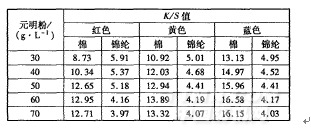 從表2可以看出,隨元明粉質量濃度增加,棉組分的K/S值逐漸增大,錦綸組分的K/S值減??;當元明粉質量濃度增加到6oL時,棉組分的K/S值達到最高;之后,再增加元踢粉質量濃度,棉組分的K/S值有所降低,錦綸組分的K/S值繼續減小。因此,在實際生產中,元明粉的合理質量濃度控制在30~60L。
