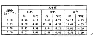 由表3可以看出,隨燒堿質量濃度增加,棉組分的K/S值逐漸降低。這是因為過量的堿劑會加速染料水解。錦綸組分適合在酸性浴中上染,燒堿質量濃度增加,染浴pH值升高,錦綸組分的得色量也顯著降低。因此,燒堿的適宜用量為1.0~1。5g/L。