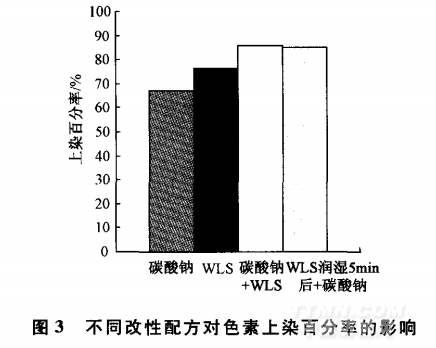 按1.2.2工藝,固定改性溫度為60℃,改性處 理總時間為30 min,改變改性工藝方法,即改變WLS與碳酸鈉的添加方式,然后按1.2.3工藝染 色,在70℃條件下染色40 min,最后測定經(jīng)不同改 性工藝方法改性羊毛纖維的上染百分率,其中WLS 用量20%(owf),碳酸鈉用量20%(owf),石榴皮色 素10 mL,結(jié)果如圖3所示。 由圖3可知,只加入WLS的上染百分率高于只 加入碳酸鈉的上染百分率;而WLS與碳酸鈉共同進行改性,上染百分率進一步提高,這是由于WLS是 一種含有多個環(huán)氧乙烷活性基的陽離子季銨鹽類改 性劑,在堿催化作用下,環(huán)氧乙烷活性基與羊毛中的 氨基等含活潑氫基團發(fā)生開環(huán)加成反應,使羊毛纖 維改性,帶有一定量的正電荷,進而增大其與石榴皮 色素間的靜電引力,改善羊毛纖維染色性能;在固定 改性總時間的條件下,采用WLS與碳酸鈉同時加入 改性浴中的一浴一步法工藝時,上染百分率最高,可達 到85.83%;而采用先用WLS處理羊毛纖維5 min后, 再加入碳酸鈉處理25 min后的一浴兩步法工藝時,由 于碳酸鈉處理時間縮短了5 min,上染百分率較一浴一 步工藝方法有所降低。說明WLS必須在堿性浴中改 性羊毛,而且堿處理時間一定要適當延長,以便使wLS 充分地交聯(lián)固著在羊毛纖維上。考慮到采用一浴一步 法改性工藝簡單,上染百分率高,因此,改性羊毛纖維 的工藝方法可采用一浴一步法工藝,即WLS和碳酸鈉 同時加入改性浴中進行改性。