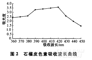 根據(jù)1.2.1工藝提取的石榴皮色素在不同波長 條件下測得的吸光度,繪制出石榴皮色素的吸收光 譜曲線,結(jié)果如圖2所示。由圖2知,提取的石榴皮 色素為黃色,其最大吸收波長為420 nm。