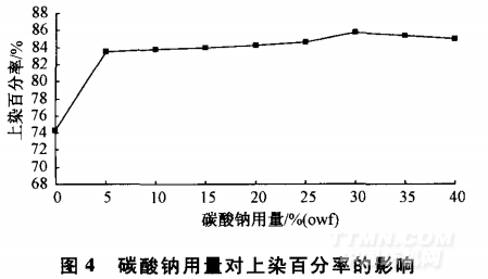 由圖4可知,不加碳酸鈉時,羊毛纖維的上染百分率只有74.26%;隨著碳酸鈉用量的增加,上染百 分率逐漸升高,當碳酸鈉用量為30%(owf)時上染 百分率達到最高85.78%,繼續(xù)增加碳酸鈉用量,上 染百分率有下降的趨勢。這是由于碳酸鈉作為催化 劑,能夠使WLS中的環(huán)氧基開環(huán),隨著碳酸鈉用量 的增加,WLS中的環(huán)氧乙烷活性基團與羊毛纖維間 形成的交聯共價鍵數量增加,改性程度提高,上染百 分率提高;但碳酸鈉用量太大,上染百分率有所下 降,原因是堿用量太大,WLS水解速率增大,同時纖 維和WLS的共價鍵有可能發(fā)生斷鍵。因此,碳酸鈉 最佳用量確定為30%(owf)。