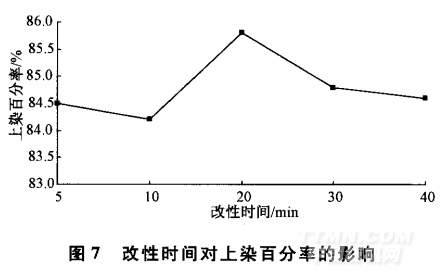 由圖6可知,隨著改性溫度的升高,羊毛纖維的 上染百分率增加,當溫度為60℃時達到最高;溫度 繼續(xù)升高,上染百分率有所下降。原因是隨著改性 溫度的升高,WLS向纖維表面吸附速率和擴散速率 加快,同時與纖維結合的速率加快,增強了改性程 度,使羊毛纖維上引入更多正電荷,從而增大了色素 與羊毛纖維之間的作用力,使上染百分率提高;當改 性溫度過高,助劑在堿液中水解速率加快,改性效果 降低,使其與陰離子染料間的親和力減小,導致染色 性能下降。因此最佳改性溫度為6O℃。2.2.5改性時間的優(yōu)選 按照1.2.2工藝,采用一浴一步法的改性工藝方法,在60 ℃條件下將羊毛纖維投入到用量10%(owf) WLS和30%(owf)碳酸鈉的改性浴中,處理5~40 min,然后按1.2.3工藝染色,在溫度為70℃,石榴 皮色素為10 mL條件下染色40 min,最后測定改性時 間對上染百分率的影響,結果如圖7所示。