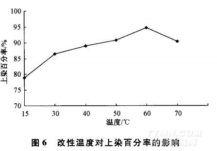 2.2.4 改性溫度的優(yōu)選 按照1.2.2工藝,采用一浴一步法的改性工藝, 在不同溫度條件下將羊毛纖維投入到用量10%(owf)WLS和30%(owf)碳酸鈉的改性浴中,處理20 min,然后按1.2.3工藝染色,石榴皮色素為10 mL,在溫度為70℃條件下染色40 min,最后測定 不同改性溫度時羊毛纖維的上染百分率,結果如圖6所示。