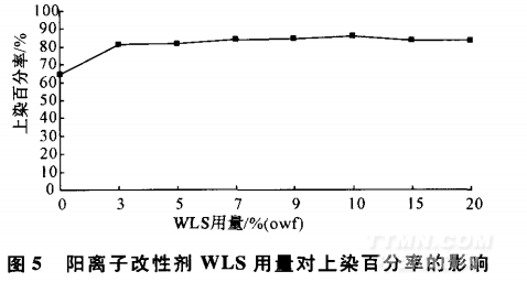 由圖5可知,不加WLS時,上染百分率僅為64.63%,隨著WLS用量的增加,上染百分率逐漸增 加,當用量為10%(owf)時羊毛纖維的上染百分率 可達85.83%,繼續(xù)增加WLS用量,上染百分率幾 乎不變。原因是隨著WLS用量增加,纖維上結合的 助劑量增多,纖維引入的正電荷亦增多,從而使染料 結合量增多。但在一定濃度的堿液中,纖維素上的 羥基發(fā)生離解,生成一定量的Cell—O-,使得反應 達到平衡時所消耗的改性劑有飽和值。綜上所述,WLS最佳用量確定為10%(owf)。