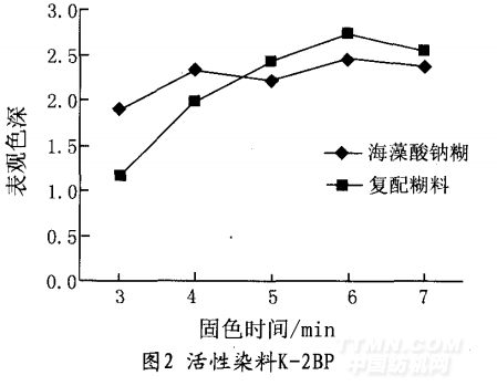 活性染料分子結構簡單,色澤鮮艷,色譜較 全,成本較低,使用方便,含有磺酸基水溶性基 團,在水中電離成染料陰離子,對硬水有較高的穩 定性、擴散性,勻染性較好。但是存在固色率低、 需高鹽染色和高濃度尿素印花等問題。 為了探討固色劑用量對染料固色率的影響,在 固色時間為60s、蒸化溫度為102℃的條件下,用活 性紅K一2BP染料對棉織物進行印花,并對印花織物所 得色深值進行測定,結果如下圖: