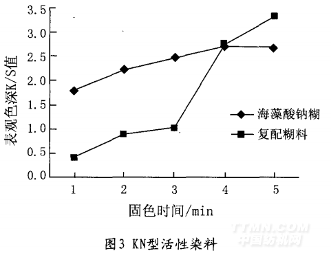 2.2復配印花糊料對表觀色深的影響 印花色漿的印花性能很大程度上取決于原糊的 性質。活性染料直接印花一般用海藻酸鈉糊,但單 一糊料難以滿足印花中的多種要求。在實際應用 中,有時為了獲得滿意的結果,使用兩種或兩種以 上的糊料,取長補短拼混制糊。為了研究復配印花糊料對表觀色深的影響,采用三種不同類型的活性染料,分別為活性艷紅K-2BP,KN型活性染料,B型活性染料,各分別用海藻酸鈉糊,復配糊料進行二相法印花(固色劑0.7g,滲透~tjOKO.2g,蒸化溫度102℃),然后分別測定其K/S值,結果見下圖: