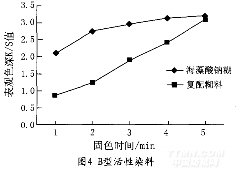 在活性染料固色反應中,pH值增高,纖維素電 離程度增加,纖維素羥基離解的數量增多,纖維帶 負電荷也多,對染料陰離子的斥力增加,因而使陰 離子染料的親和力(或直接性)降低。當pH值約大 于10.5后直接性急劇下降,與此同時,染料水解反 應速率隨pH值的升高迅速增加,固色液的堿性越強 并不利于染料的固色。 從上圖可以看出,隨著固色劑用量的增加表觀 色深值越大,當固色劑用量超過0.7%后,增加用量 表觀色深值增加不大,從實際應用考慮,固色劑用 量并不是越大越好。