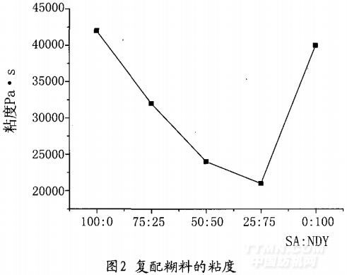 海藻酸鈉與NDY糊料按100:0、75:25、50:50、25:75、0:100比例復配后的粘度如圖2: