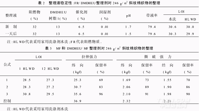 盡管阻燃整理的耐久性(大于25次)隨著MF樹脂的增加和DMDHEU的減少而減少,但卻明顯地改善了織物的阻燃性和強力。