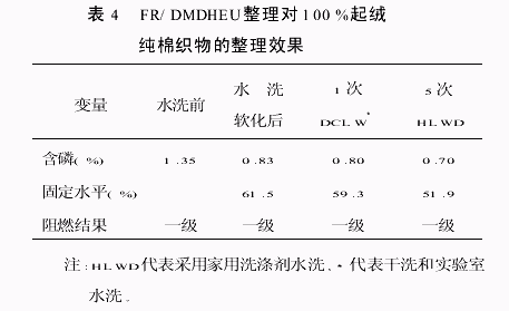方案3 由24%FR,7%MF樹脂,6%催化劑,0.2%H3PO3,4%柔軟劑,0.01%潤濕劑組成。帶液率<80%,溶液處理后在60℃烘干3min,在170℃焙烘2min(表3)然后在40℃用洗滌劑水洗。
