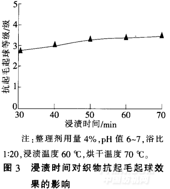 由圖3可知.隨著浸漬時間的 延長.織物的抗起毛起球效果略微 提高:當浸漬時間超過6O min后. 織物的抗起毛起球效果變化不大 因此可得出.浸漬時間對織物抗起 毛起球效果的影響并不顯著。