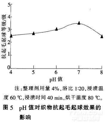 由圖5可知,整理液pH值的 不同.對織物的抗起毛起球效果影 響不同。在偏酸性或偏堿性時.織 物的抗起毛起球效果減弱;當pH 值為7時.織物的抗起毛起球效果最好。