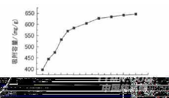 由圖3可知,隨pH值的增加,復合微球對酸性紅337的吸附容量逐漸減少,當pH值大于5時,復合微球的吸附容量迅速下降。雖然pH值為1時吸附容量最高,但酸性太強不利于復合微球的穩定,因此復合微球較適合的pH值為2~3。