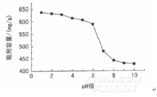 在復合微球質量濃度為0.5g/L、染料質量濃度為0.5g/L和30℃吸附100min的條件下,pH值對吸附容量的影響見圖3。