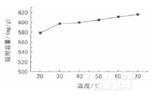在復(fù)合微球質(zhì)量濃度為0.5g/L、染料質(zhì)量濃度為0.5g/L、pH值為2.5和時(shí)間100min的條件下,溫度對(duì)吸附容量的影響見圖5。