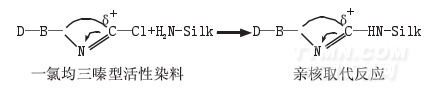 在酸性浴中,帶有陰電荷的活性染料可與真絲纖維以離子鍵發生結合,這是酸性浴中活性染料上染真絲纖維的主要原因。在酸性條件下仍有氨基與真絲纖維的共價反應,但真絲纖維上的氨基[1]含量很低(0.2 mol/kg),故酸性條件下的共價鍵結合有限。在堿性浴中染色,主要是真絲纖維上的氨基和羥基氧負離子與染料分子中活性基團的親核取代(或加成)反應,以共價鍵結合。堿劑的加入有利于真絲纖維-NH2的存在和真絲纖維-OH電離成氧負離子,從而有利于染料與纖維以共價鍵結合。以二氯均三嗪型染料為例,反應如下: