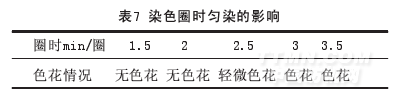 根據我們的生產經驗,溢流染色機染色圈時一般在2.5 min/圈,就能保證棉纖維不產生色花;從表7可以看出,殼聚糖毛巾的染色圈時在2 min/圈才能保證其不色花,如果圈時很短,殼聚糖毛巾與導布輥接觸的幾率增加,毛巾表面就會產生毛羽現象,同時擦傷現象很嚴重;如果圈時太長,殼聚糖毛巾堆置在溢流機內的時間很長,殼聚糖毛巾的內部溫度不均勻,染料的擴散也不均勻,殼聚糖毛巾就容易產生色花,2.5 min/圈時是染色的臨界圈時,故我們在殼