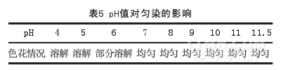 從表5可以看出,pH值4~5之間殼聚糖已經溶解無法染色,這是由于殼聚糖中的-NH2與H+反應使其溶解;pH值5~6之間,殼聚糖有部分溶解,故染色之前一定嚴禁酸洗;故確保染色時pH值不能低于7,保證殼聚糖不溶解,當pH值在7~11.5之間染料均勻上染染色。