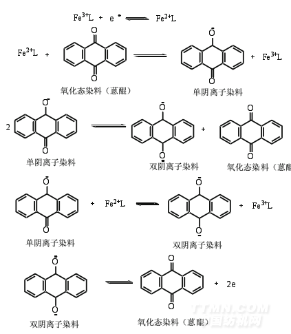 在可逆的電化學工藝中,第一步還原反應(yīng)是Fe3+絡(luò)合物在陰極表面獲得一個電子,被還原成Fe2+絡(luò)合物;被還原的Fe2+絡(luò)合物從陰極擴散到染料粒子表面,在粒子表面發(fā)生電荷轉(zhuǎn)移(包括單電子轉(zhuǎn)移),形成單陰離子染料,這是形成被完全還原的雙陰離子染料的中間步驟。有二種途徑可形成被完全還原的雙陰離子染料。對大多數(shù)染料來說,每還原一個染料需要二個電子,二個單陰離子染料可生成一個完全被還原的雙陰離子染料,并重新生成一分子氧化態(tài)染料。形成雙陰離子染料分子的另一個反應(yīng)機理可能是:首先發(fā)生單電子轉(zhuǎn)移,形成單陰離子染料分子,然后單陰離子染料被還原形成雙陰離子染料分子。