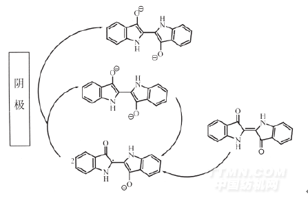 Albert Roessler直接采用靛藍作為電子載體進行靛藍染料的電化學還原。染色開始時,先采用少量的保險粉對部分染料進行還原,生成染料隱色體,然后在電化學的作用下,懸浮在溶液中的染料顆粒與染料隱色體作用,生成一種介于染料本身和染料隱色體之間的離子自由基。離子自由基的還原相對容易,反應(yīng)產(chǎn)物在實驗條件下比較穩(wěn)定。在離子自由基的作用下,電化學還原過程自發(fā)進行,整個反應(yīng)過程如下: