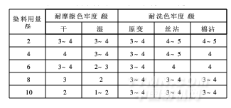 由表3知,耐洗色牢度都達到3級以上;而耐摩擦色牢度隨著染料用量的增加而減小,當染料用量達到10%時,耐干/濕摩擦色牢度只有1~2級,不符合國家標準。綜合考慮,染料用量可選擇4%、6%、8%。