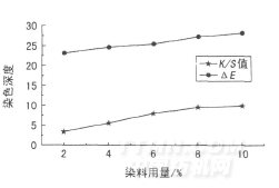 由圖1可見,隨著染料用量的提高,K/S值與色差ΔE都逐漸增大,當染料用量大于8%時,K/S值增加變緩。其原因是染料用量越大,平衡吸附量也越大,纖維上染料吸附量也越高,織物的表面顏色深度就越深。