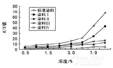 由圖1 可見,染料Ⅰ的上染率高于標準染料,其原因是分子結構中帶有一個陽離子電荷和一個額外的羥基。標準染料的上染率高于染料Ⅱ、染料Ⅲ和染料Ⅳ,是由于隨著柔軟劑基團中烷基鏈長增加,上染率下降。在染色的吸附階段,染料大分子中硬脂酸結構的阻礙作用,降低了長鏈烷基染料對棉纖維的直接性,導致上染率下降。幾只染料的上染率高低順序為: