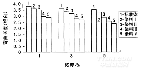 由圖4 和圖5 可知,標(biāo)準(zhǔn)染料染色織物的( 經(jīng)緯向) 彎曲長(zhǎng)度最高,而染料Ⅳ染色織物的彎曲長(zhǎng)度最低。隨著柔軟劑基團(tuán)中烷基數(shù)量的增加,織物經(jīng)緯向的彎曲長(zhǎng)度減少,且經(jīng)向較緯向的彎曲長(zhǎng)度降低更多。染色棉織物彎曲長(zhǎng)度( 經(jīng)緯向一致)大小排序如下: