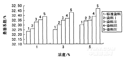 由圖3 可見(jiàn),標(biāo)準(zhǔn)染料染色織物的懸垂性最低,而染料Ⅳ( 其烷基數(shù)最多) 染色織物的懸垂性最高。懸垂性隨著柔軟劑基團(tuán)中烷基數(shù)量的增加而提高。染色棉織物的懸垂性排序如下: