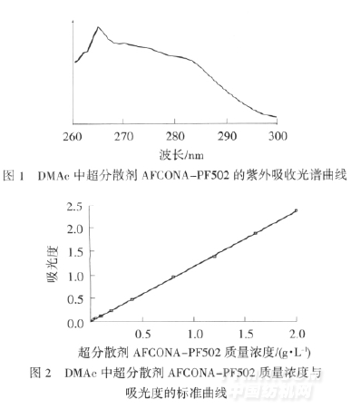 利用紫外可見分光光度計測試DMAc溶液中超分散劑AFCONA-PF502的最大吸收波長,從圖1可以看出,它的最大吸收波長為266nm.在此吸收波長下,以吸光度對超分散劑的質量濃度作圖,得到標準曲線(如圖2所示),曲線呈現良好的線性關系,相關系數R2=0.9997.