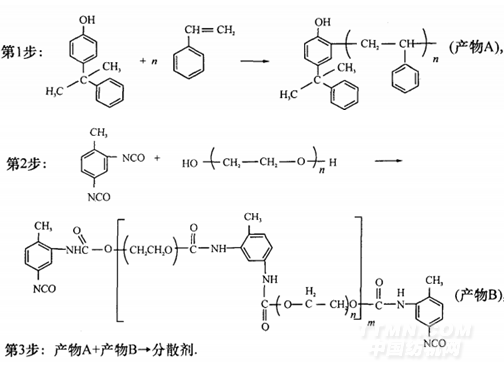 按照Ffiedel-Crafts反應,本實驗用4-枯基酚和苯乙烯為原料,酸性催化劑為催化劑,將苯乙烯鏈段接在4-枯基酚的鄰位上形成酚類產物,再通過過量的TDI和聚乙二醇6000反應生成端基含NCO的預聚物,然后將過量的酚類產物和預聚物反應合成所需的高分子分散劑[2-3].反應步驟如下: