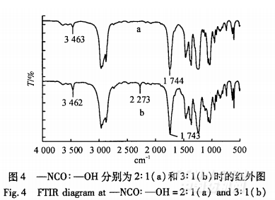 由圖4顯示,-NCO:-OH=2:1時,樣品在2200~2300cm-1沒有吸收峰,而在3462cm-1處有一較強吸收峰;在3:1時2273cm-1處有吸收峰在3462cm處也有一較強吸收峰,2273cm-1處峰為N=C=O伸縮振動吸收峰,3462cm-1處為氨基甲酸酯中N-H的變形伸縮振動峰,從而證明3:1時樣品中存在N=C=O基團,2:1時不存在N=C=O.并根據譜圖中羰基吸收峰的位置在1743cm-1處而非在異氰酸酯二聚體羰基I770~1783cm-1處和異氰酸酯三聚體羰基1689~1709-1cm處,初步可以斷定實驗得到了預期產物[7].