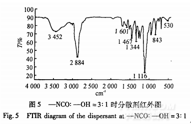 TDI和聚乙二醇6000中-NC0和-0H按3:1進行反應生成預聚物后,立即加入稍過量的堿洗后的酚類產物繼續反應,直至生成分散劑,冷卻至室溫,過濾除去溶有未反應酚類產物的溶劑,得到分散劑,取樣進行紅外測試,如圖5所示.