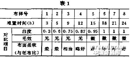 一、前言生產燈芯絨以間歇式為主,前處理大多是在卷染機上一次完成。工藝路線雖然簡短,但退煮程度的缸差嚴重影響了卷染質量,產品手感粗硬、光澤萎暗。雖然部分燈芯絨的前處理采用軋卷退煮,平幅連續氧漂,但產生倒毛、皺條,且成品手感亦不甚理想。為了進一步改善產品質量,并適應市場對燈芯絨產品數量上的要求,從公司的實情出發,前處理作冷軋堆試驗.經過生產實踐,證明該工藝易使織物保留一部分棉蠟,對絨類織物的成品手感大有改善,與卷染機配套基本上能滿足漂、色布的生產.且工藝流程短、占用設備少,對減少疵布、降低能耗,取得明顯效果。目前,我公司燈芯絨產品的前處理已全面推行冷軋堆工藝。二、理論依據燈芯絨成品要求其堅實 美觀、絨面豐滿平整、絨條清晰四潤、手感彈滑柔軟、光澤柔和均勻。因而除需做好燒毛以前的各道工藝外,退漿要盡。當前處理采用常規工藝時,尚需加強柔軟及上蠟整理來達到以上質量要求。冷軋堆是用堿、雙氧水和高效精練劑與織物在室溫下作用,能去除漿料、棉籽殼等雜質。一般而言,棉纖維本身存在的油脂蠟質需高溫才能除盡,采用冷軋堆工藝恰能保持其一部分油脂蠟質,這樣對燈芯絨成品的手感大有好處。三、小樣試驗1.前處理織物規格16條44×134 經燒毛的全棉燈芯絨工藝冷軋堆堿氧一浴法溫度15℃操作:將處理液置于小軋槽內,取經燒毛的燈芯絨lm,在小軋車上三浸三軋,軋余率約9O %。浸軋后卷在玻璃棒上,并用塑料薄膜包好,于15℃下放置,每隔3h取樣,取樣后布卷仍用塑料薄膜包好,放置,所取樣布用水洗凈、烘干,試驗結果見表1。