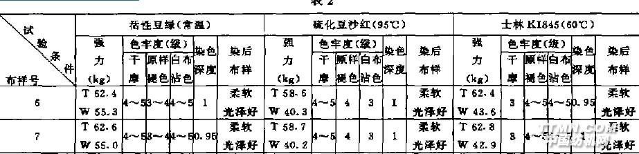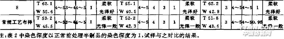 從表1可看出,冷堆時間(以室溫15℃為準)需18h以上,各項指標都較理想,但在具體生產中應接環境溫度略作調整。2.染色取6、7、8三塊已處理洗凈烘干的樣布與常規前處理半制品在同樣條件下,作小樣浸染試 驗,對比結果(見表2)。