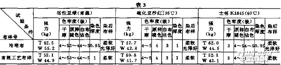 可行的。(2)由于冷軋堆工藝對纖維損傷小,成品強力比常規工藝好。(3)布面光澤度較好。(4)成品手感柔軟滑爽。四、大樣試驗及批量生產1·前處理(1)采用三組平洗箱,多浸三軋上卷,增加浸漬時間來提高織物的吸收滲透程度。(2)穩定帶液率在8O 左右,每卷織物長度約500m,避免卷染分卷的困難(3)冷堆時間保持24h2.染色(1)采用卷染機染色與常規工藝的半制品作平行試驗。(2)染色染料用活性、硫化、還原三類染料。(3)在染色前需增加水洗工序:熱水4道,冷水2道,漂白。活性染料染色時一定要洗至布面不帶堿為止。(4)染色結果比較(見表3)