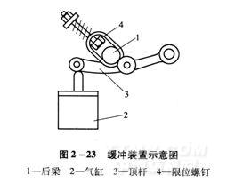 緩沖裝置:送經(jīng)機(jī)構(gòu)的緩沖裝置是一個(gè)液壓緩沖器,可減小后梁因開(kāi)口、打緯運(yùn)動(dòng)產(chǎn)生的震動(dòng),消除經(jīng)紗張力的高頻波動(dòng)(圖2—23)。