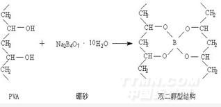 PVA是多元醇,硼砂可以在PVA大分子間產(chǎn)生雙二醇型結(jié)構(gòu),形成立體交聯(lián),其膠凝作用較大。反應(yīng)式如下: