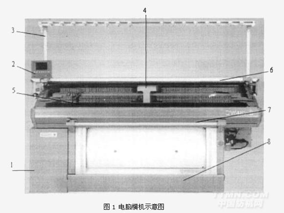 電腦針織橫機的主要結構如圖1所示。它主要包括如圖的8個部分:主控制箱、操作面板、紗架、橫機機頭、針床、走梭軌道、牽拉桿、底架。根據標號對各部分結構的功能進行說明。