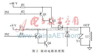 驅動電路采用雙電壓方式,其原理圖如圖2所示。輸入信號IN1是8ms的單穩態信號,控制48V電源打開電磁閥;輸入信號IN2是引緯的保持信號,控制9V的電源以保持電磁閥的打開狀態;為了保證足夠的驅動能力,兩路信號的驅動三極管都采用達林頓方式;雙二極管D1是為了防止電源切換時48V電源串接到9V電源中;L1為引緯電磁閥,由于電磁閥為感性器件,在電磁閥關斷時OUT端因電感的儲能特性會出現一個比較高的負壓,若產生的負壓高于Q2和Q4三極管的最大承受電壓,則可能會損壞Q2和Q4三極管。這里的亞敏電阻Y1就是消減過高負壓的保護元件。