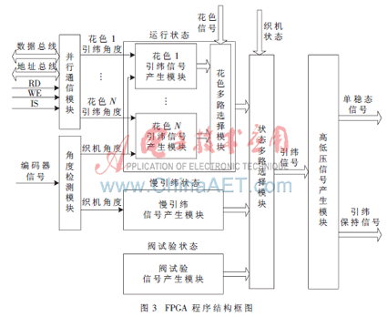 FPGA程序結構框圖如圖3所示,其子模塊有:織機角度檢測模塊、并行通信接口模塊、引緯信號產生模塊、多路選擇模塊、高低壓驅動信號產生模塊等。