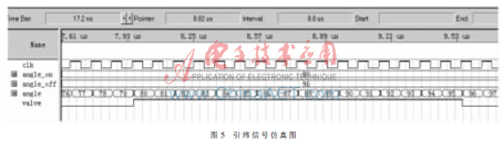 FPGA本質上是由硬件組成的,其編程語言也為VHDL等硬件描述語言,它的程序并行執行,也就是說一旦主機角度或設定的打開關閉角度有變化,幾十路的引緯信號就會立即同時輸出,誤差僅為信號的建立時間,只有幾納秒。因此FPGA產生的引緯信號可以很好地滿足噴氣織機對引緯控制精度和控制一致性的要求,從根本上改變處理器產生引緯信號的弊端。引緯信號仿真圖如圖5所示:設定打開角度為80°,設定關閉角度為96°,引緯信號在這個區間內有效。由圖5可以看出,引緯信號的產生和關閉幾乎沒有任何延時。