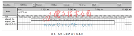 在FPGA中雖然沒有單穩態電路,但是可以采用時鐘計數的方式來模擬單穩態的產生:在信號的上升沿開始計數并設置單穩態信號有效,計滿8ms的時鐘脈沖個數后停止計數并設置單穩態信號無效,這樣就可以輸出精確的8ms單穩態信號。例如,假設采用8k的計數時鐘頻率,64個計數時鐘周期就是8ms,單穩態信號的誤差不會超過0.125ms,高低壓驅動信號仿真圖如圖6所示,其中signal_8ms為8ms單穩態驅動信號,signal_hold為低壓驅動信號。